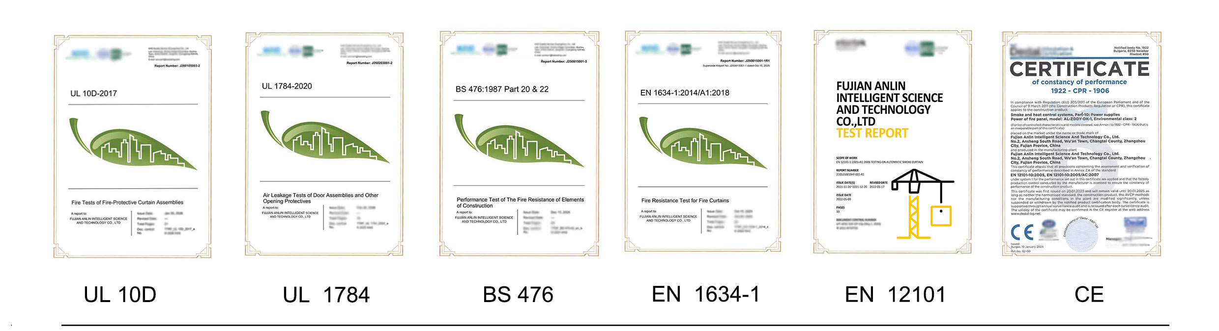 In life-safety applications, reliable performance requires rigorous testing and certification.UL 10D: Standard for Positive Pressure Fire Tests of Vertical Shaft Enclosure AssembliesUL 1784: Standard for Air Leakage Tests of Door AssembliesBS476: Evaluate the fire resistance of building materials and fire protection systems.EN 1634-1: Fire resistance tests for door and shutter assemblies - Application tosmoke and heat control systemsEN 12101: Specification for sroke barriers used in smoke and heat control systemsCE: Indicates that the product complies with EU safety, health, and environmentalrequirements; this is a mandatory certification for accessing the EU market.